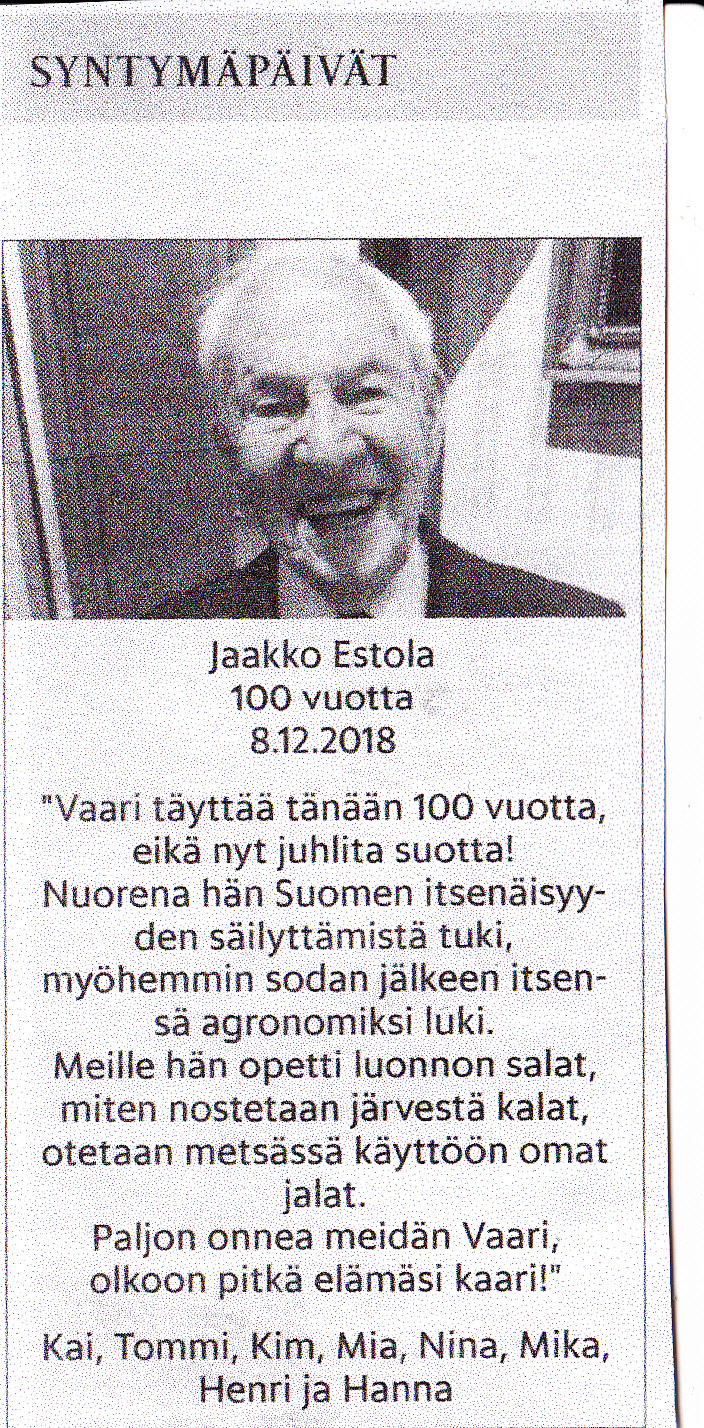 Agronomi Jaakko Estola kuoli 17.1.2023 Helsingissä 104-vuotiaana. Hän oli syntynyt 8.12.1918 Hyvinkäällä. Hän kävi koulunsa Keravan yhteiskoulussa ja lukiossa, jossa kirjoitti ylioppilaaksi 1939. Sitten hän lähti armeijaan, Reserviupseeri kouluun ja sieltä sotarintamalle. Vuodet 1939–1944 kuluivat talvi-ja jatkosodassa tykistössä tulenjohtajana. Itä-Karjalassa Krivin rintamaosuudella vuonna1943 hän haavoittui vakavasti: luoti lävisti keuhkon ja tuli selästä ulos. Kuolema oli lähellä, mutta sotasairaalassa elämä kuitenkin voitti.