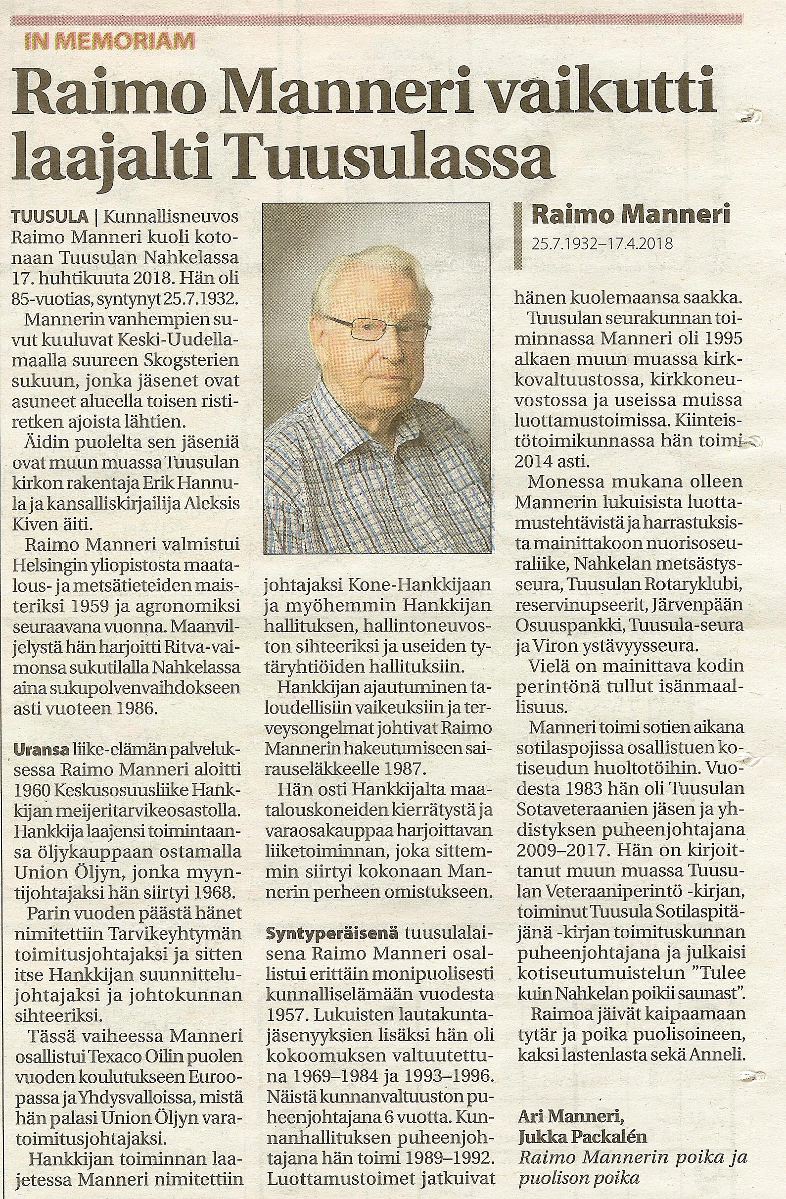 Muistokirjoitus 20.5.2018 Keski-Uusimaa